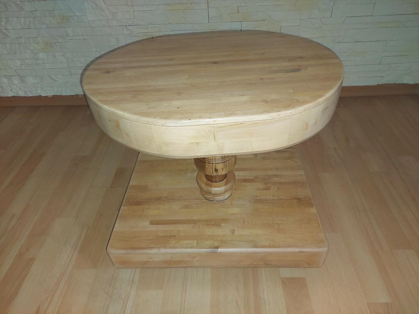 Zaś stolik kawowy jest wykonany ze sklejonych kostek różnych kostek różnych drzew jest na kółkach gdyż jest dość masywny blat jest obrotowy