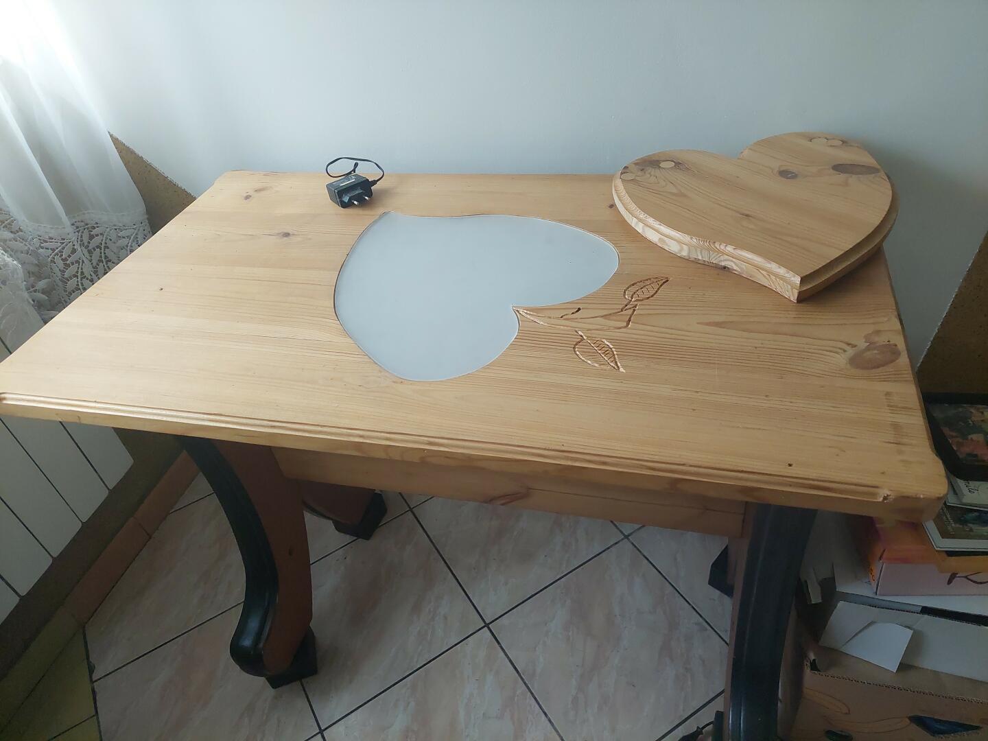 Blat stołu z drewna sosnowego ozdobne nogi zaś z drewna afrykańskiego w blacie jest podświetlenie w kształcie liścia w to miejsce również można włożyć taki sam liść z drewna więc będzie ozdobna podstawka